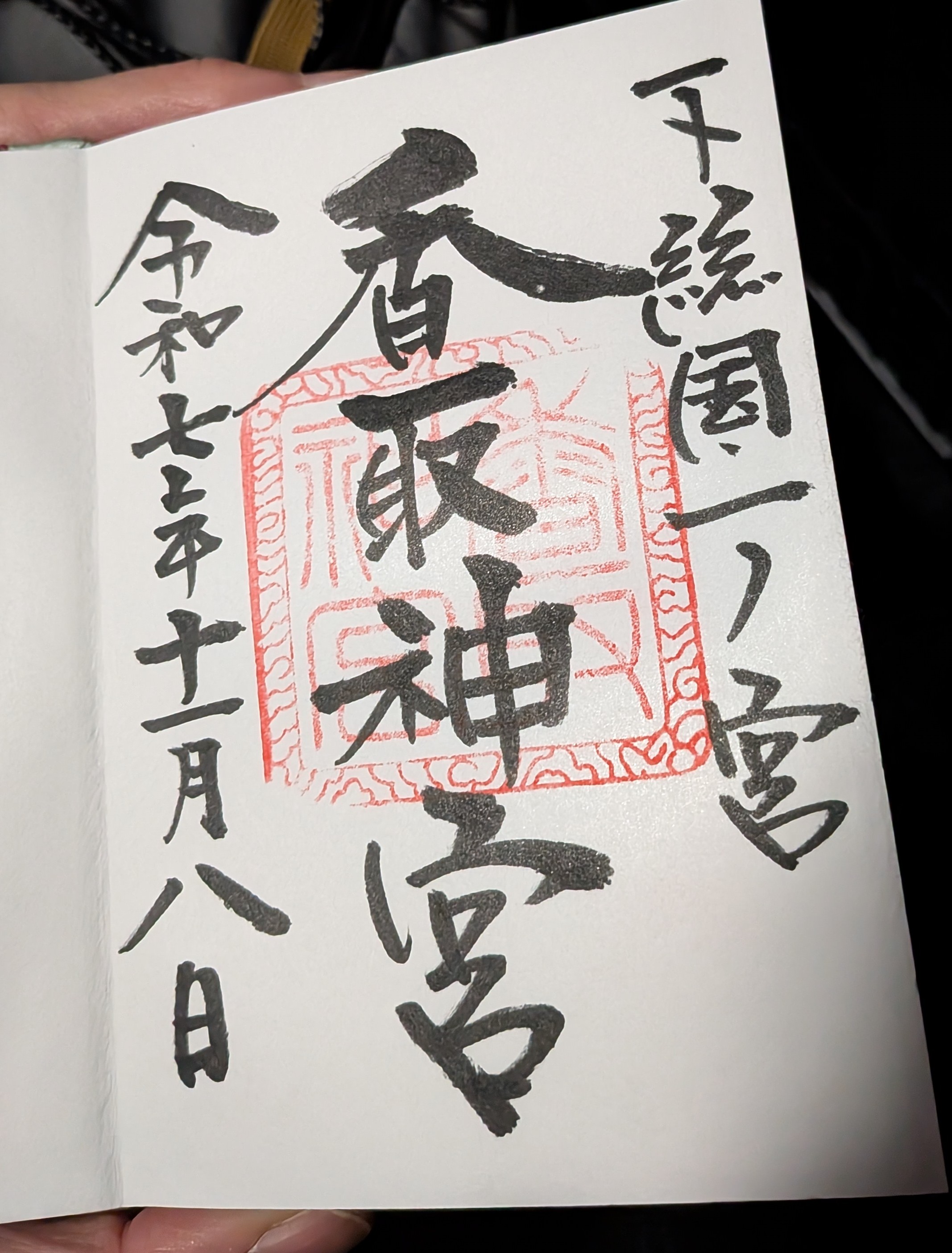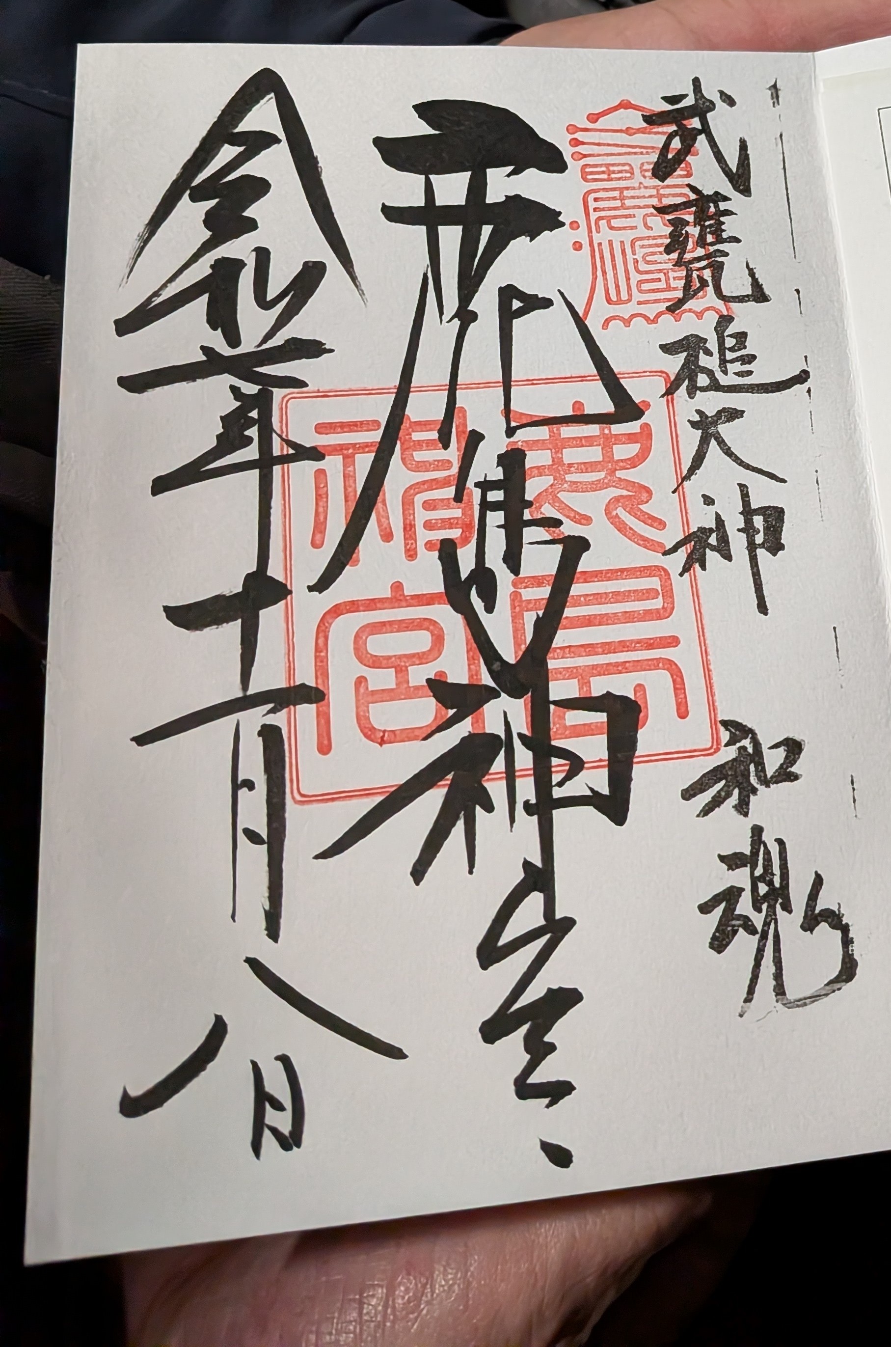 すでに夕闇が迫り、香取神宮へと急ぐ。ツアーの最初に訪れた鹿島神宮とは利根川を挟んで南にある香取神宮には、閉門10分前に到着。各々参拝を済ませ、御朱印マニアの椿阪さんも朱印をゲット。旅を締めくくりました