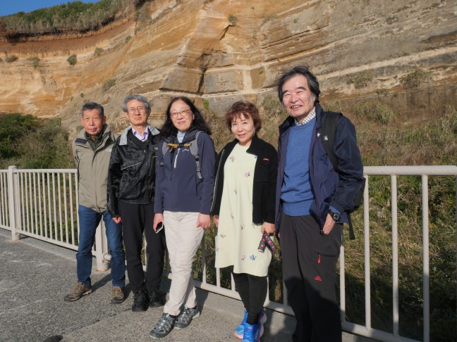 ツアー常連で筑波大学元教授の地質学者、久田健一郎さんの解説を聞きながら、犬吠埼の西方にある「屏風ヶ浦」へ移動。海の波で台地が削られ切り立った崖か続いています。